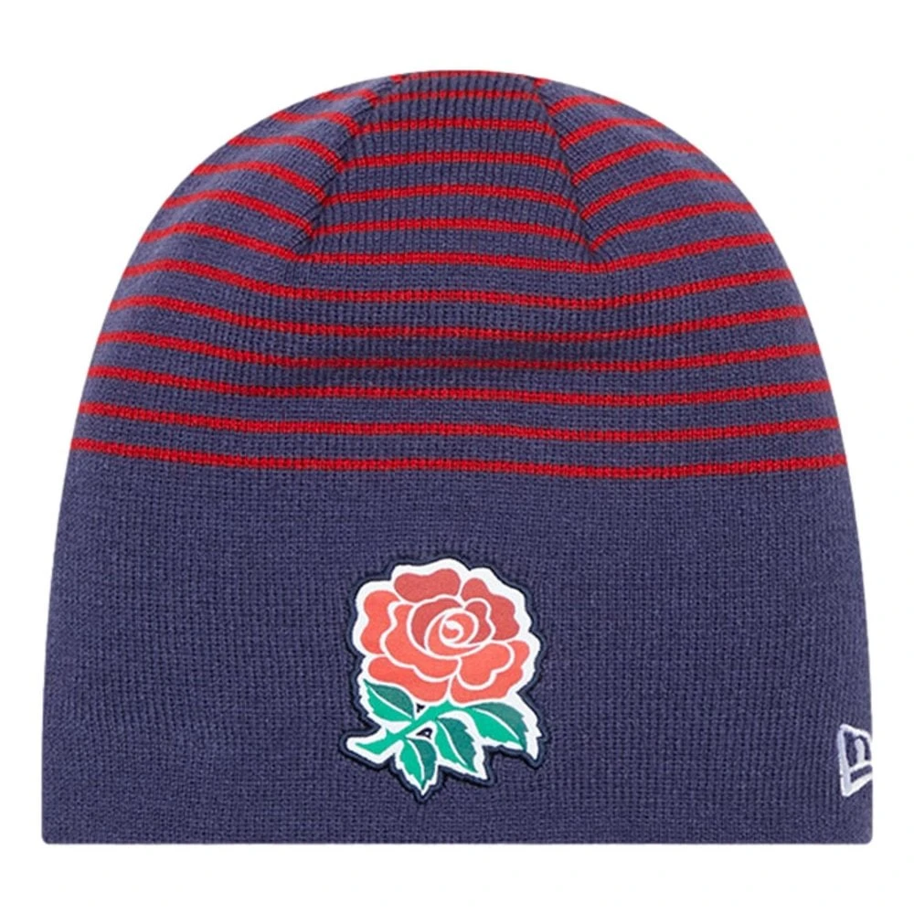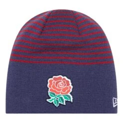 The New Era England Rugby Cuff Beanie. Wear England’s traditional rose logo on matchday by picking up the official New Era England RFU Light Navy Skull Beanie Hat. Completed in a Light Navy and red colourway, the striped crown features the English rose on the front and an embroidered NE flag to the left.