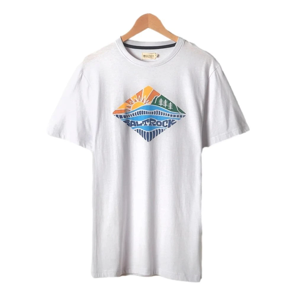 Step out in style this Summer in the Diamond Scene T-Shirt. Made from 100% Cotton fabric for a comfortable and breathable feel. This style features a large diamond graphic on the front with elements of the sun rising over the sea and Saltrock branding.
