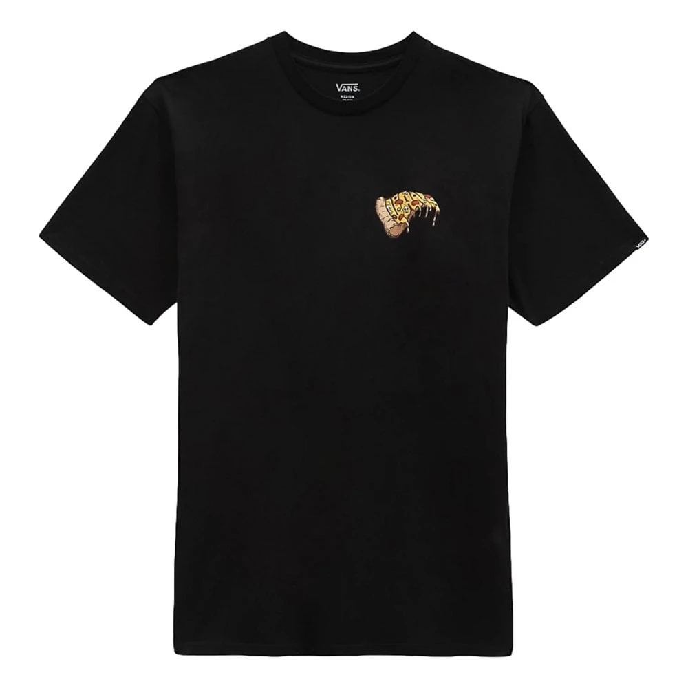 The Vans Pizza Night Short Sleeved T-Shirt features a slice of pizza on the left chest, short sleeves, a crew neck, and a Vans tab logo.