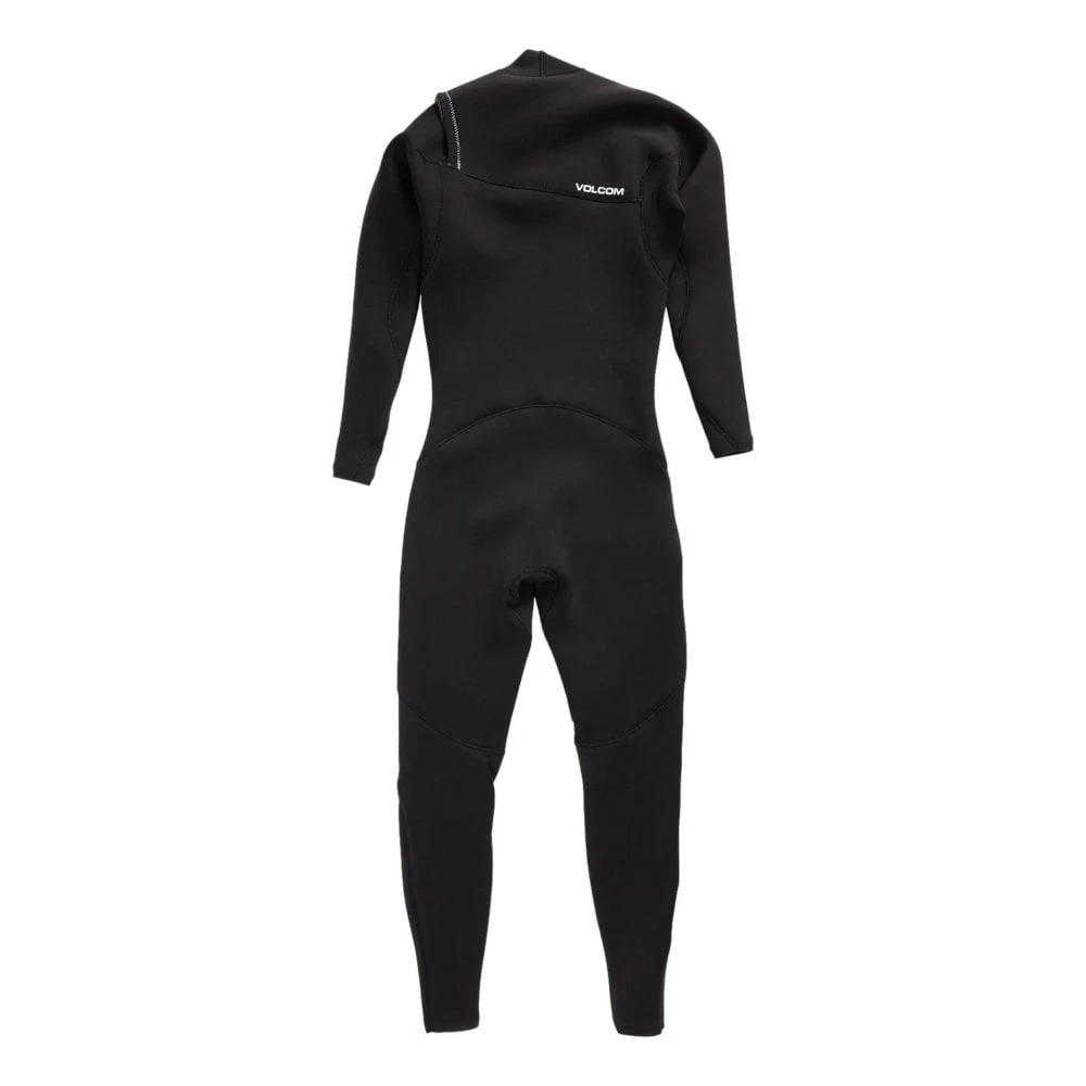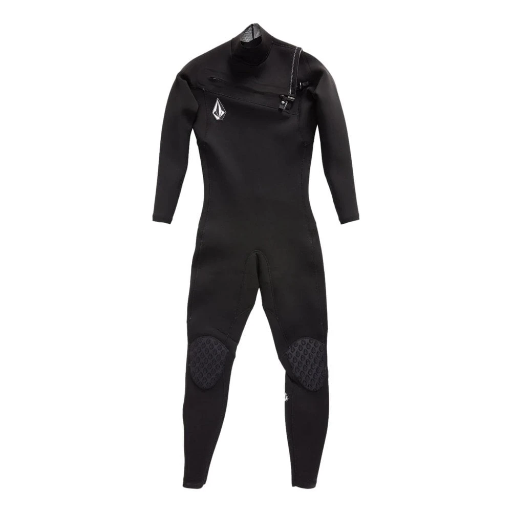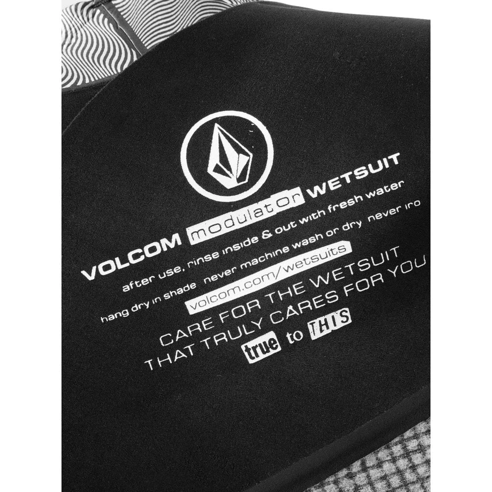 The Volcom Modulator 3/2mm Chest Zip Wetsuit Features Volcom wordmark on back shoulder, Front Stone branding, Chest zip closure with YKK metal zip pull, Op art print inner zip flap, Internally taped seams, Soft quick dry thermal inner lining, Stone shaped embossed knee pads and Back leg denim style Stone branding